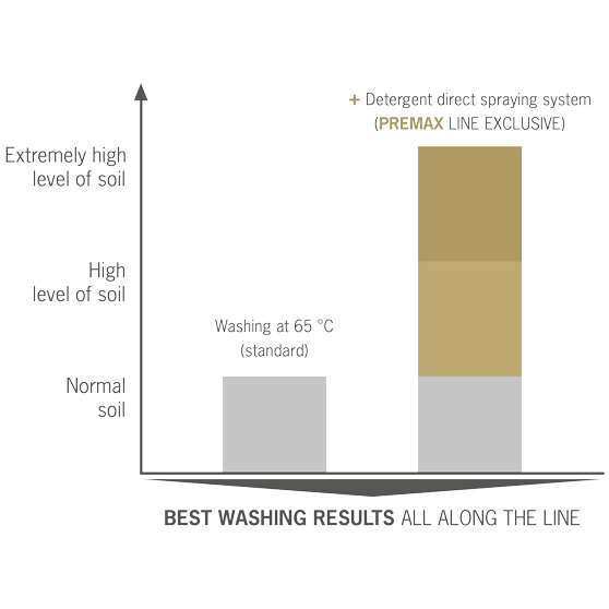 Pour cette raison, les lave ustensiles PREMAX pulvérisent un détergent concentré directement sur les ustensiles. Celui-ci agit pendant 30 secondes directement sur les salissures avant de lancer le lavage vapeur. Un pré-trempage manuel est ainsi nettement réduit voire totalement superflu.