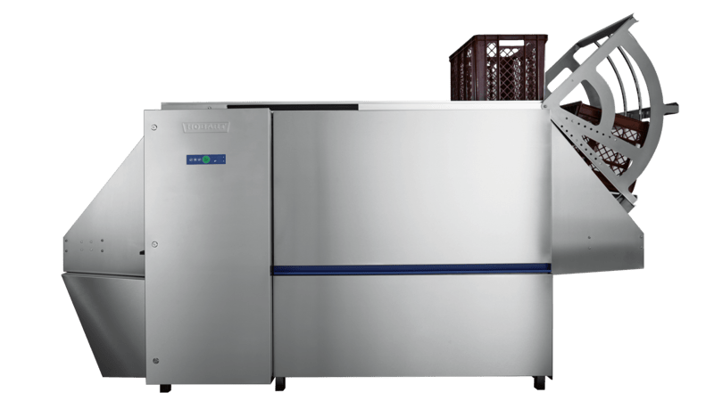 - Option idéale pour le fonctionnement par une seule personne. À la sortie, les cagettes sont insérées dans la voie d‘alimentation, chargées dans la machine par le retourneur, nettoyées et retirées à la sortie.
