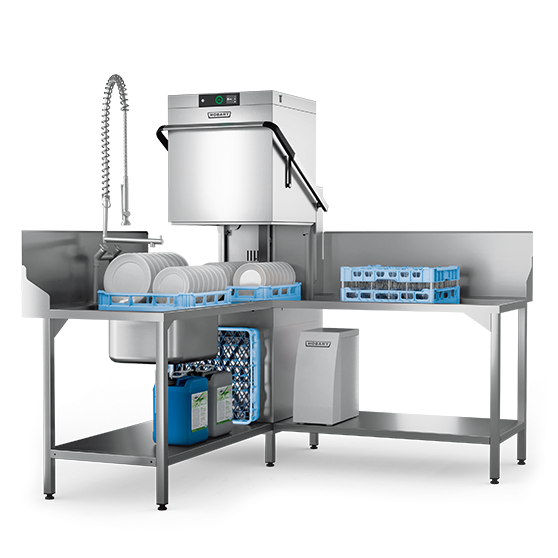 Les lave-vaisselle à capot HOBART peuvent être installés en fonction de l’organisation du travail dans le local et adaptés au flux de vaisselle. Le chargement des casiers peut tout aussi bien s’effectuer par la gauche que par la droite. Outre une installation linéaire entre deux tables, les lave-vaisselle peuvent également être positionnés en angle et intégrés avec un système de tables. Même si elle est logée dans un coin, la machine s’adapte au flux de vaisselle, le chargement peut être frontal ou latéral.